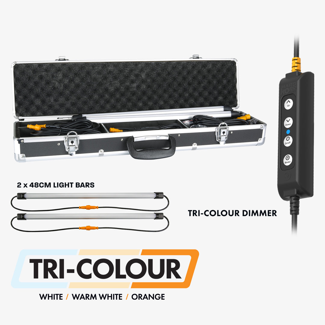 Our 2 bar LED camping light kit is designed to be a perfect starter kit for those with small setups or who are just starting out with camping. It is also a popular choice for illuminating canopies or toolboxes.