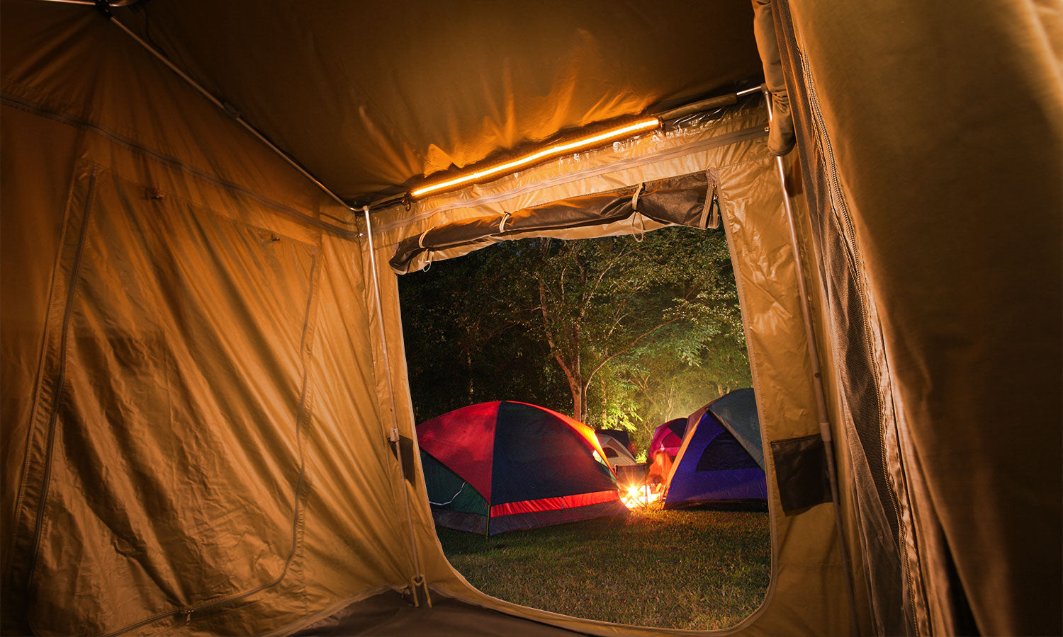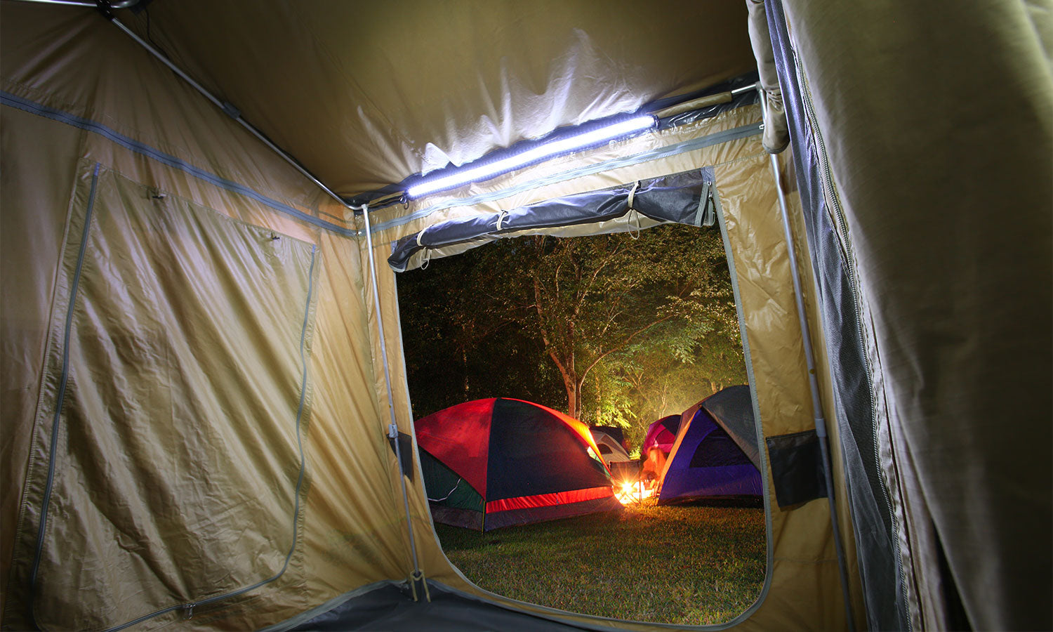 Our Lifestyle Ezy-Fit LED strip is very simple to set up, and is ideally suited to be used in tent awnings or anywhere you want to set up a light quickly. You can use the Velcro® strips sewn into the back to quickly attach to a pole, or use the inbuilt sail track to slide straight into the channel of most awnings or annexes.