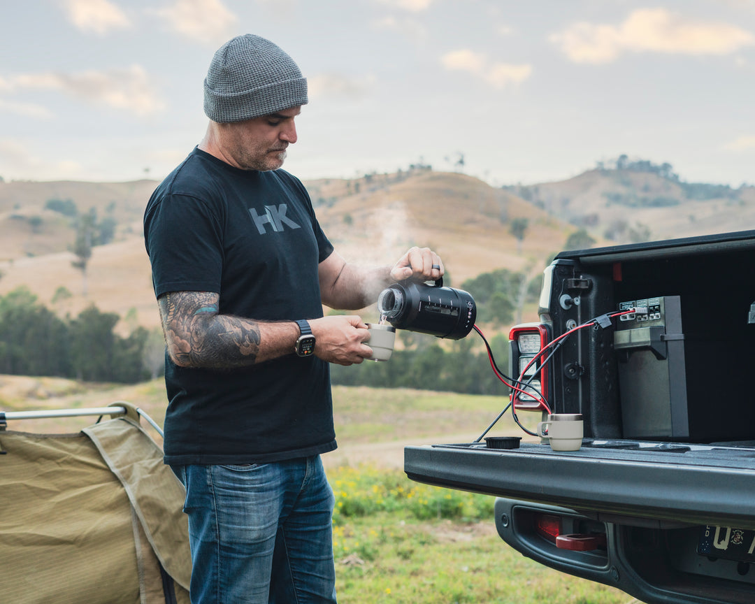 Powered by an Anderson-style plug, it connects seamlessly to your 12V battery, making it safe, compact, and hassle-free solution for your campsite or vehicle setup.