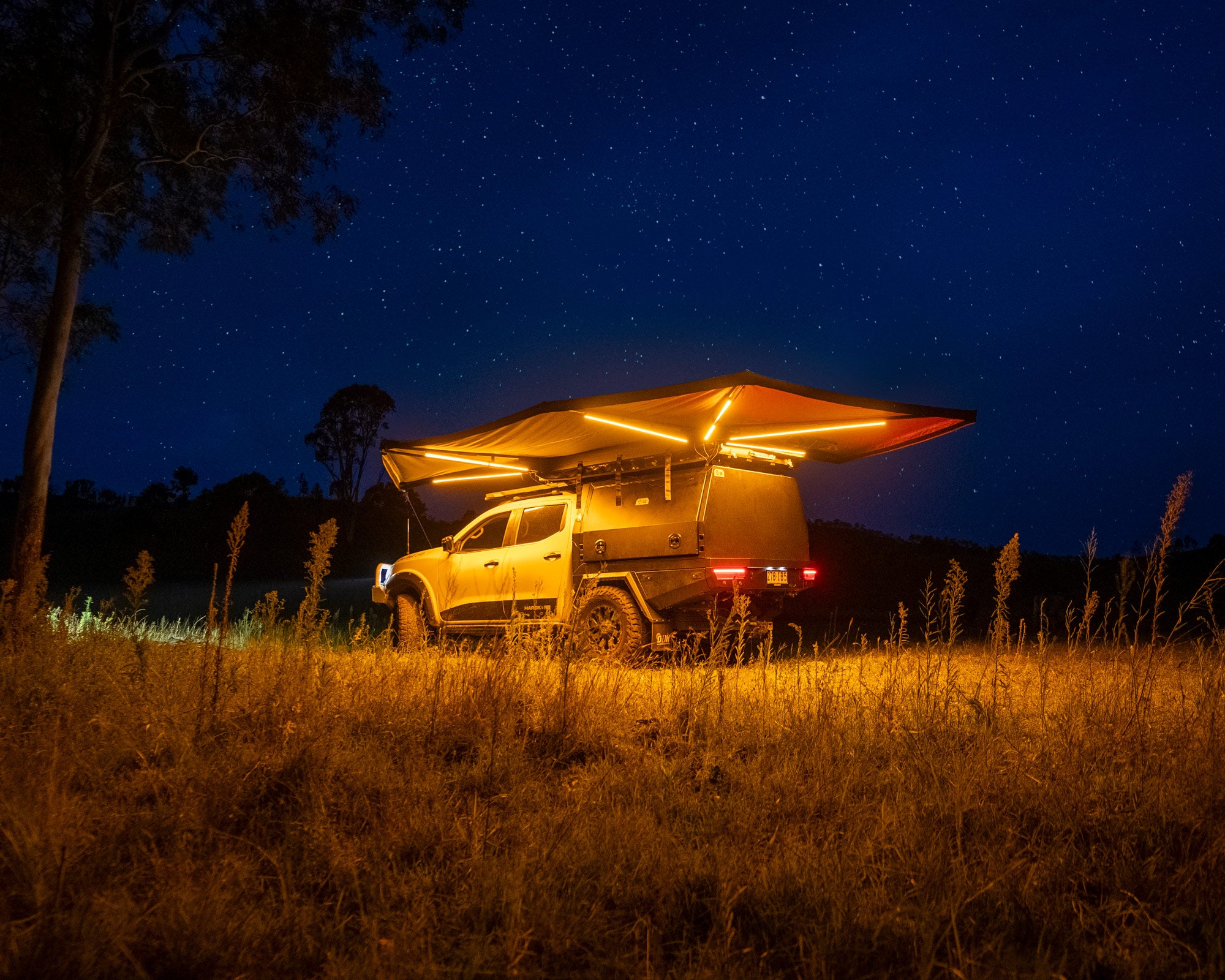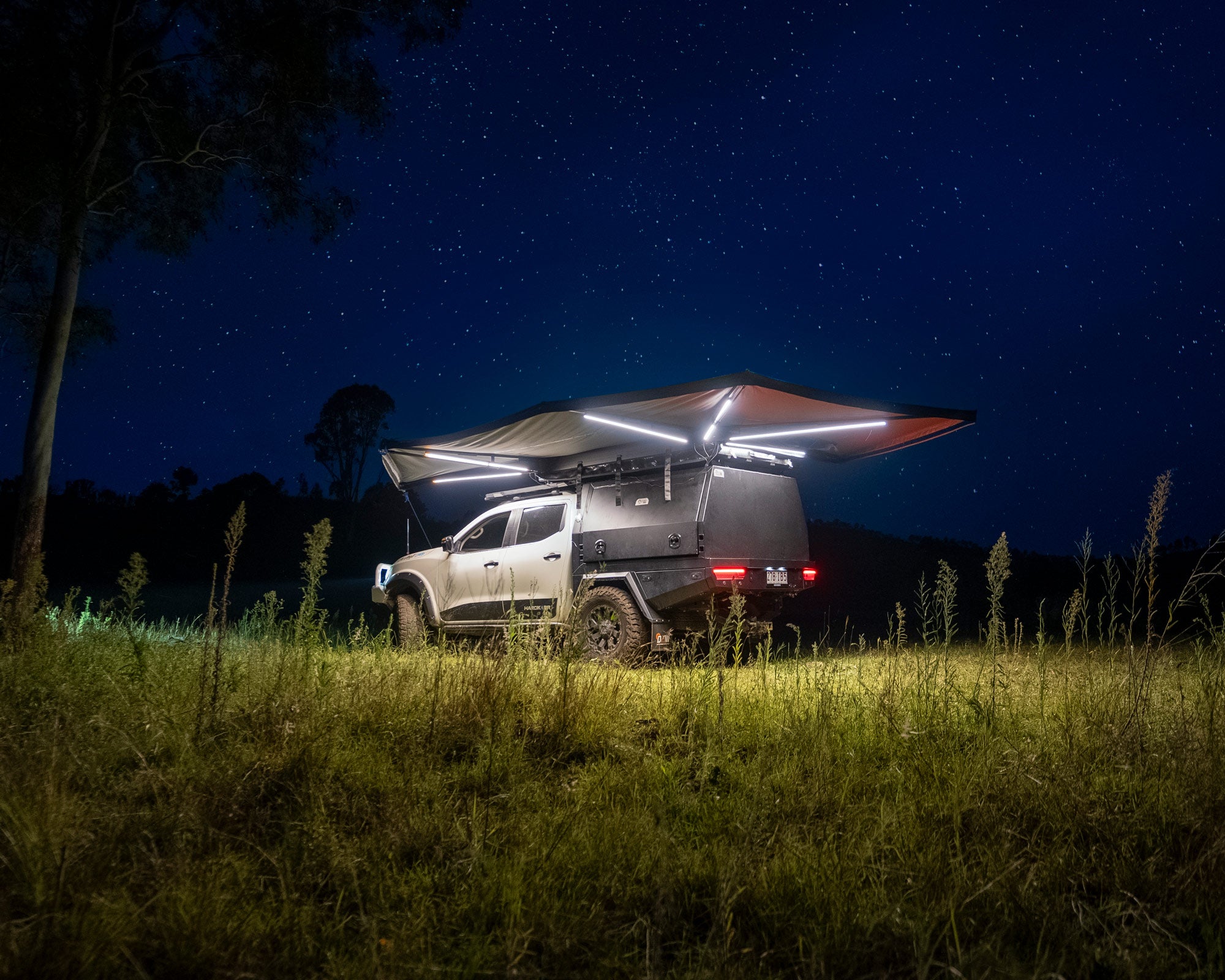 The 270° awning features inbuilt lighting, including six 1300mm tri-coloured LED light strips that deliver over 9000 lumens of brightness. Each light strip is independently switchable, allowing you to customize the lighting to suit your needs, whether you’re setting up camp, cooking, or simply relaxing under the awning. The tri-colour functionality includes an orange light setting, which is specifically designed to help keep bugs away, ensuring a more comfortable and enjoyable outdoor experience.