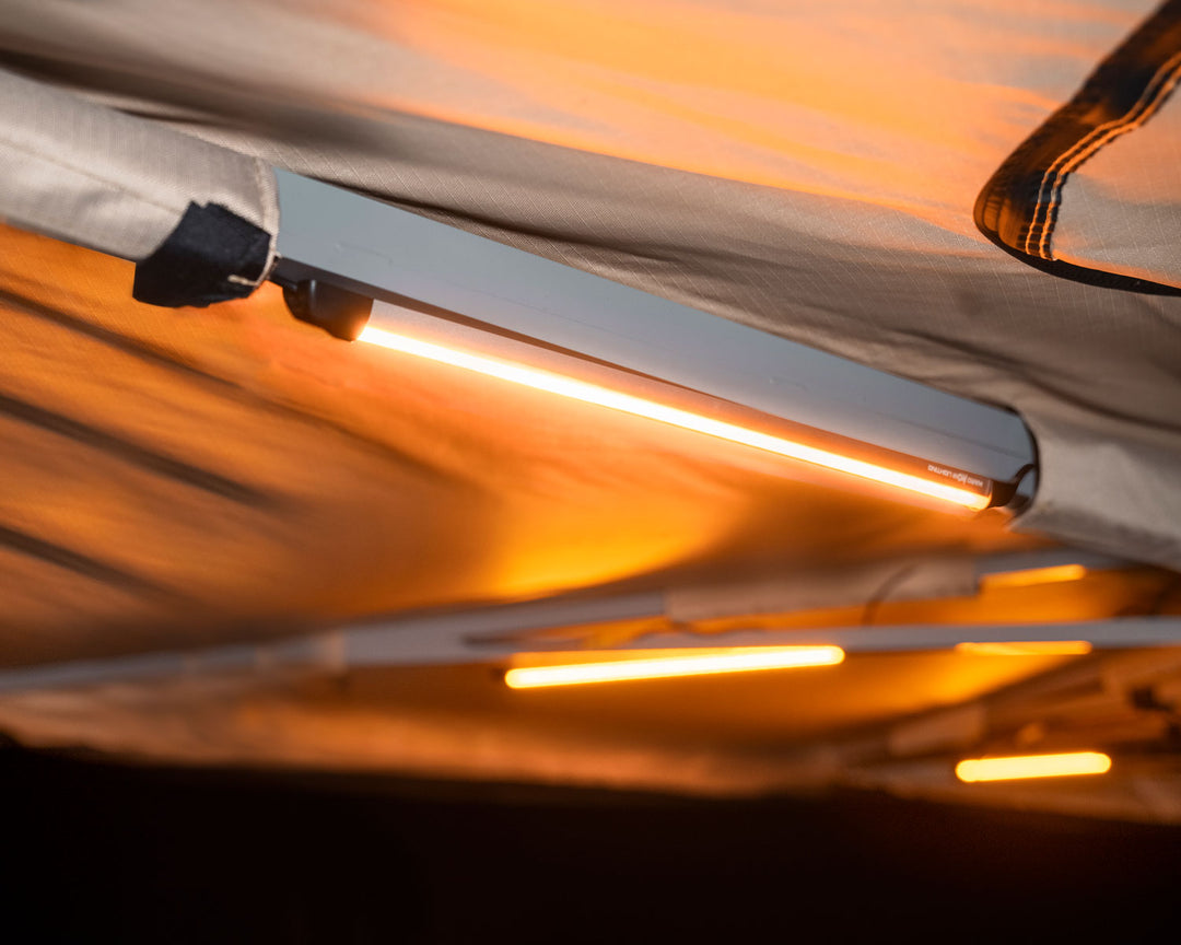 Each bar comes with both orange and white LEDs, and using our exclusive tri-colour dimmer switches, you can create three distinct colours of light - cool white, warm white and orange. The cool white light provides maximum brightness, whereas the new warm white setting gives off a light that is almost as bright as cool white, but with a pleasant soothing warmth. It’s perfect for setting a calm, happy mood in your campsite, particularly later at night. Finally, switching to the orange light naturally reduces the presence of bugs by up to 90%, and is particularly useful around food preparation and eating areas.